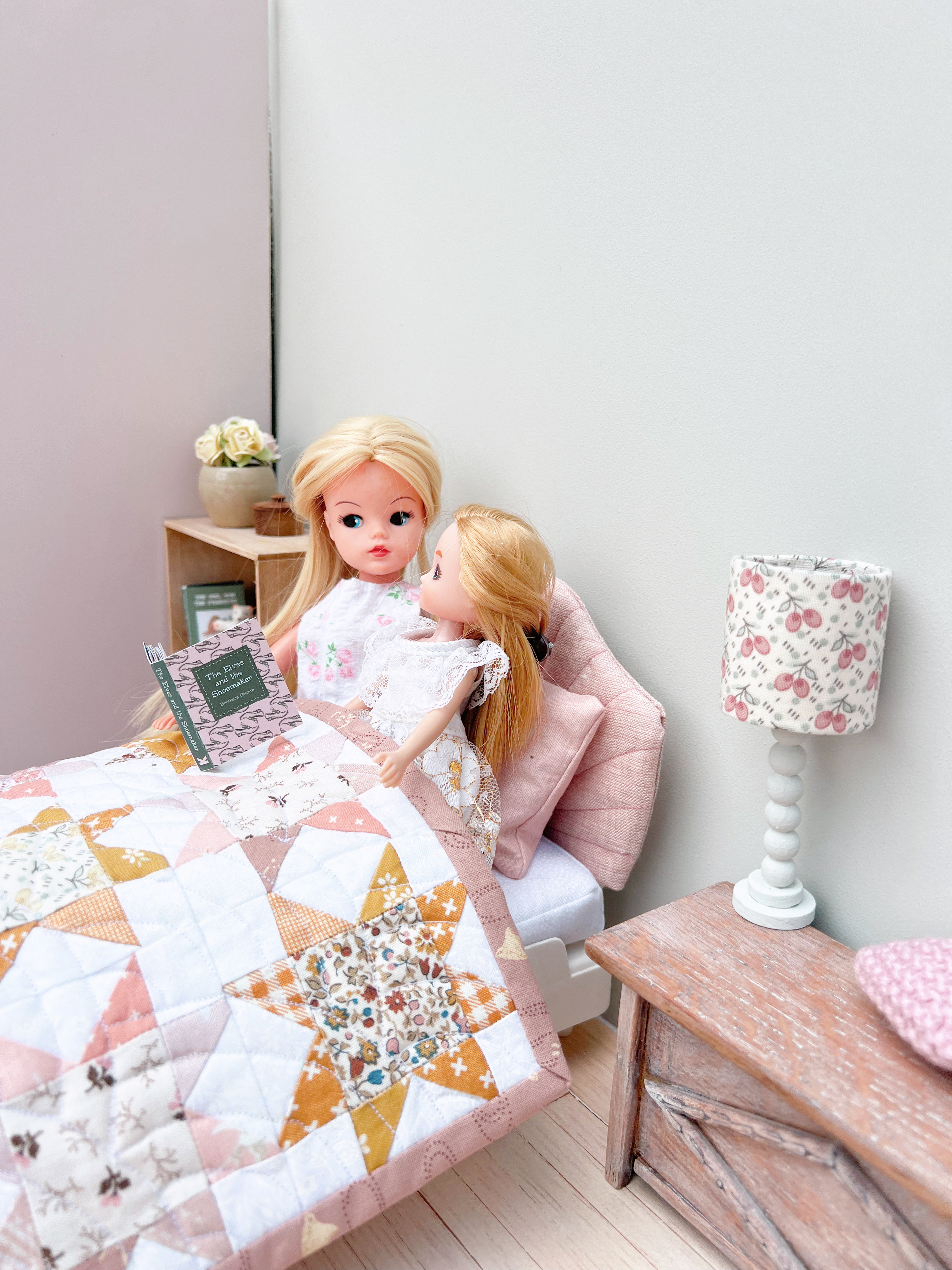 Start by selecting some lovely pretty fabric scraps and a larger piece for the backing fabric and binding. You’ll also need some thin quilt wadding. You’ll then need to head over to Rosie Taylor Crafts and download the free templates for foundation paper piecing. I used the flying geese 1 1/2 x 3″ one for the Maileg mouse quilt and the 3″ sawtooth star for the Sindy bed quilt. As you know the finished size of each block, you can easily work out how many you will need to make a quilt of the right size for your doll bed. Rosie has done a sawtooth star tutorial on You Tube so you can see how the FPP method works. Once you’ve got your head around which way the fabric goes, then it’s relatively easy to sew. The nice thing is that using the paper template means that you can get accurate blocks at a small scale – which would be trickier if using traditional patchwork methods. She also has good videos on her Instagram. If you prefer written instructions rather than a video then have a look at this post from Amy Smart ‘Diary of a Quilter’.