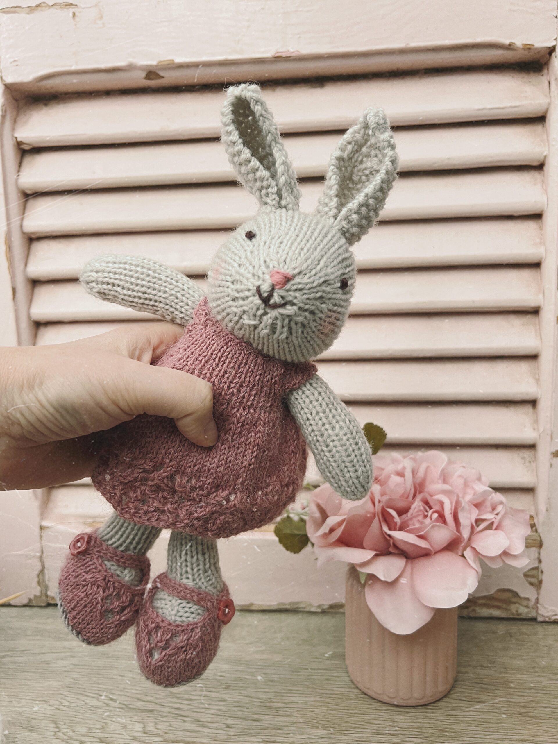 In my mission to improve my knitting skills I have recently started using the patterns from Little Cotton Rabbits . The patterns are designed by Julie who began Little Cotton Rabbits in 2003 when she knitted a small rabbit for her daughter. I have made a basic 9″ rabbit (they come in 2 sizes) and a dress and shoes. I have also been practicing lace style knitting in mohair (not for the faint hearted!) by making toy scarves with a free pattern which you can download from Ravelry. Knitting toys and their clothes has really been helping my knitting skills and teaching me to read the patterns correctly. I still make lots of mistakes but it’s the learning that is important and no-one is examining them too closely (not like on Game of Wool!). Julie also has a blog with lots of useful knitting tips and yarn advice which is helpful for beginners. The instructions have been really clear (so I can’t blame them for my mistakes!) with photos for more complicated parts of the process and recommendations for instructional videos for different stitch types.